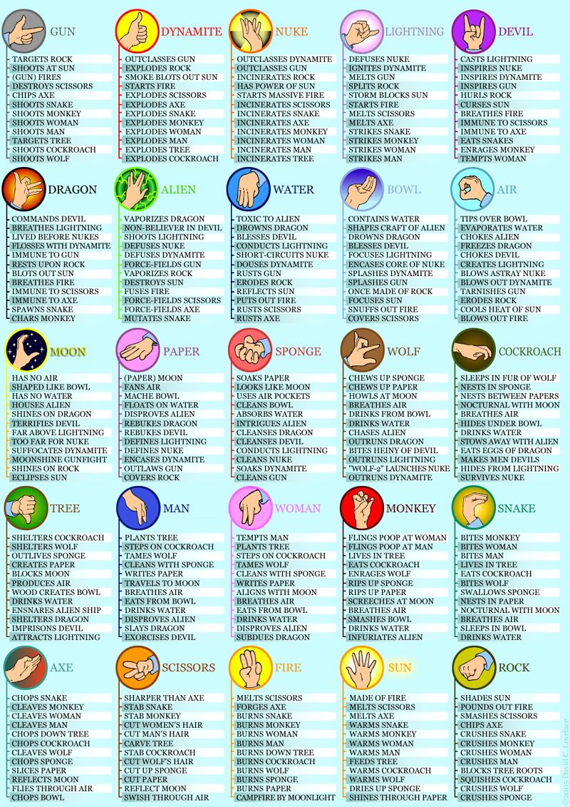 Select not just the 25-gesture version (RPS-25) but among several smaller versions as well, to prevent brain poppage. There are 1- and 2-player modes for any game.