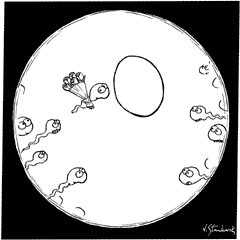 My wife and I are shooting for a baby. Trouble is, I seem to be shooting blanks. I called Dr. Klope for a sperm count, which always struck me as tedious work. Can you see the poor guy on the microscope?